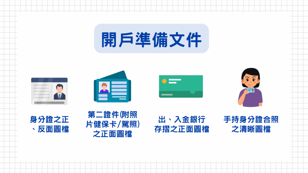 整個開戶線上資料填寫時間約5-7分鐘,請先準備好以下文件即可開始填寫: