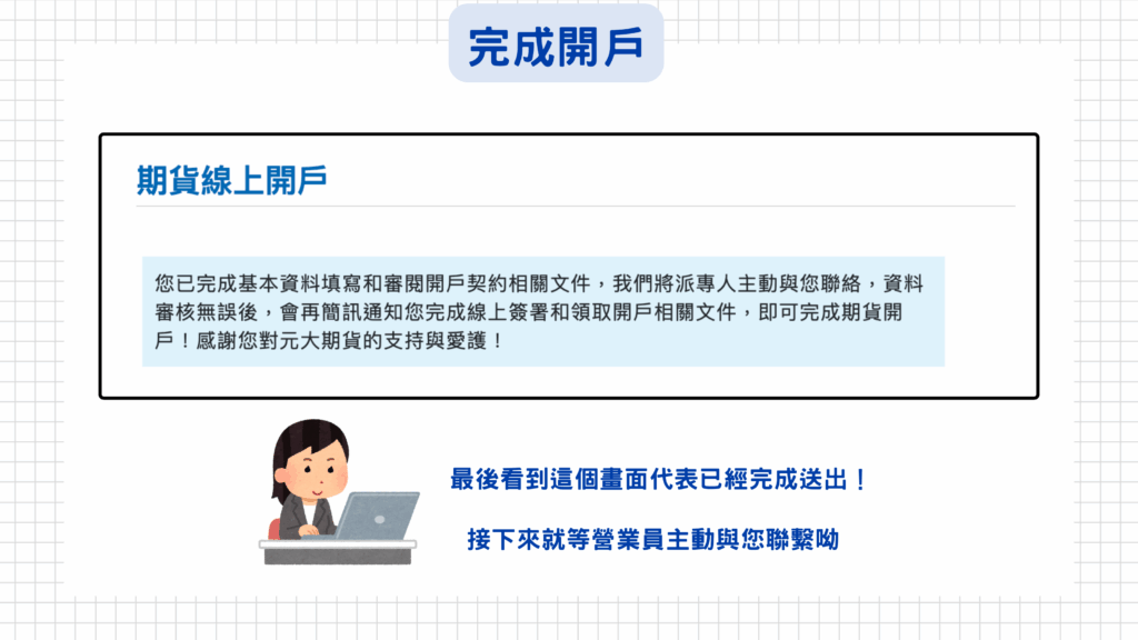step12:恭喜你到最後一步啦!最後是期貨線上同意書,請務必全部點選完畢最後一步按下送出即完成(完成畫面如最後一張圖所示),後續會由公司分派給營業員,等營業員收到資料後會再與您做電話照會,確認資料皆無問題後就完成線上開戶囉~