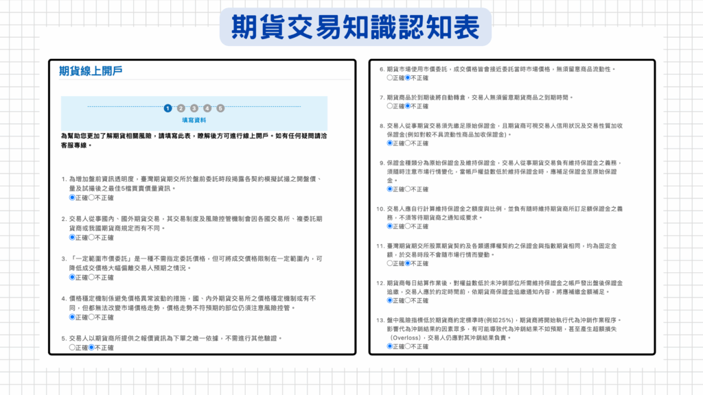 step4:開立期貨戶都必須填寫『期貨交易知識認知表』,總共是20題,內容為期貨及選擇權交易的基礎觀念,建議每一題都可以看過一遍,如有不清楚的地方可以詢問營業員